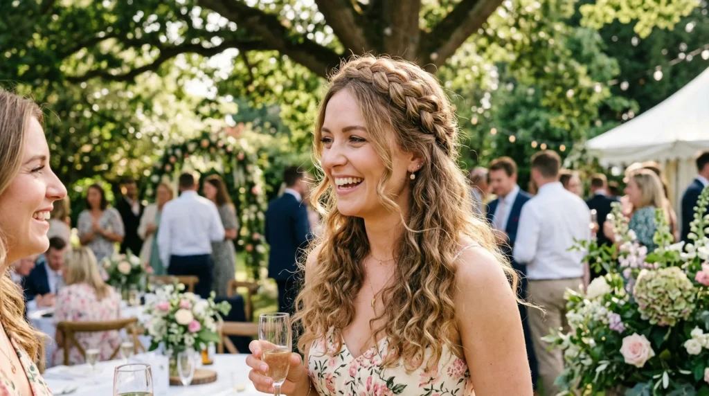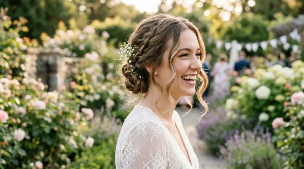 | Milkmaid Braid + Curls | Romantic occasions | Medium | Braid crown + free curls |