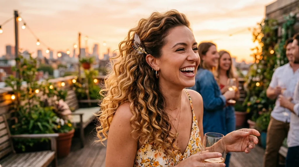 This is the natural curly hairstyle that thrives on second or third-day hair. Don’t fight that. Lean into it completely. A spritz of water to reactivate the curl pattern, a single pump of curl cream worked through the mid-lengths, hair gathered loosely upward with some pieces deliberately left out. That’s the entire process.