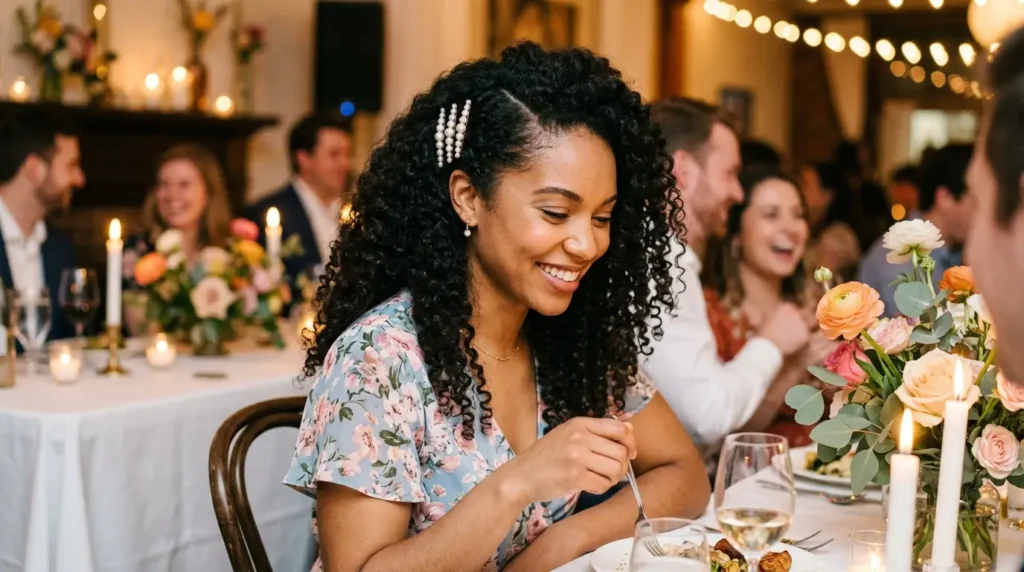 For the curl definition, a texture foam on second-day hair plus a quick diffuser session keeps the shape alive without product buildup. A wide-tooth comb to gently loosen the roots, a few intentional pearl or metallic pins to hold the part and add sparkle. That’s it.