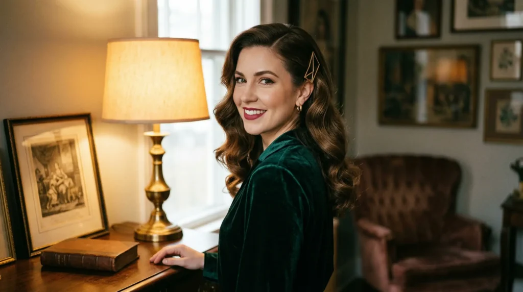 Timeless. That’s the word. Brushed-out waves, a deep side part, and one angular gold hair clip that anchors the whole mood. This is old Hollywood brought fully into 2026 — and the accessory isn’t decorative, it’s structural. It holds the whole vibe together.