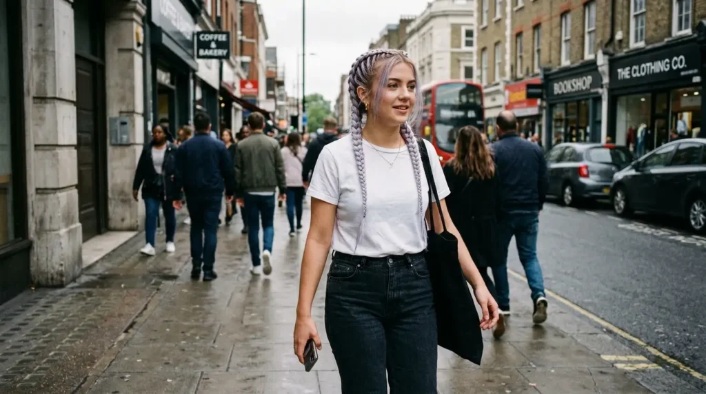 The last one on this list might be the most wearable of them all for everyday life. Double Dutch braids with a deeper root and sunkissed honey-blonde highlights running through the lengths. The roots add depth. The highlights give it warmth and movement. The plaits are loose enough to look lived-in rather than severe.