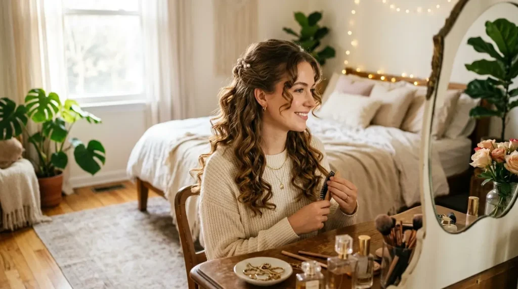 | Half-Up Romantic Curls | Soft, vintage | Dates, birthdays | Medium |
