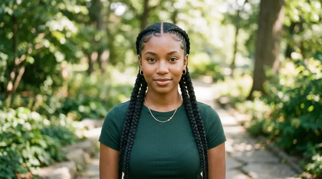 Knotless braids and clean protective styles are expected to remain at the forefront in 2026, and this classic twin braid look sits right in that family. For the edges to stay smooth and fresh, start with a hydrating leave-in and finish with an alcohol-free edge control gel. Sleep in a silk scarf at night to maintain the shape and keep the moisture in.