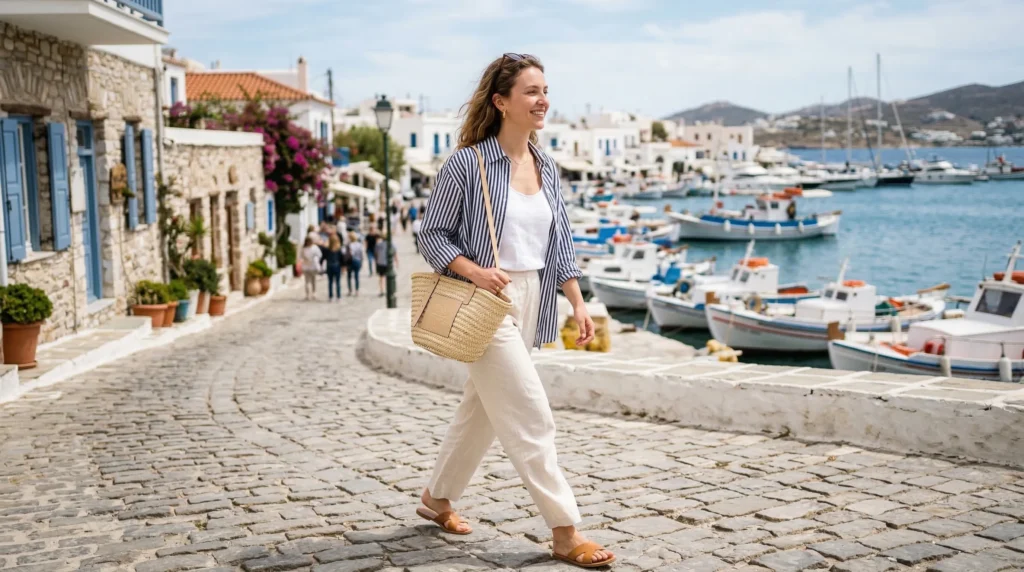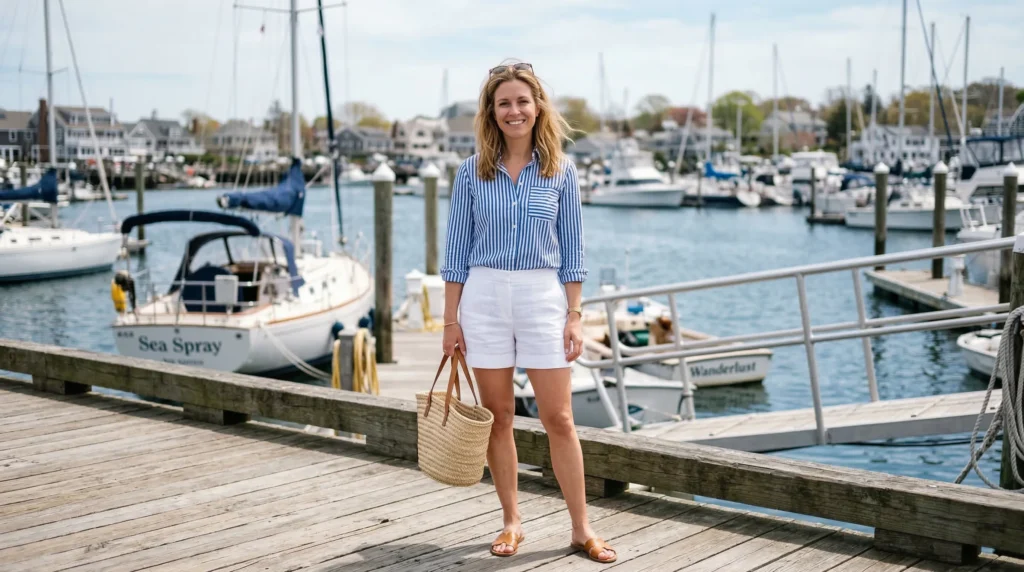 | Striped shirt + pants | All-day coastal wear | Cotton, chambray | None needed |