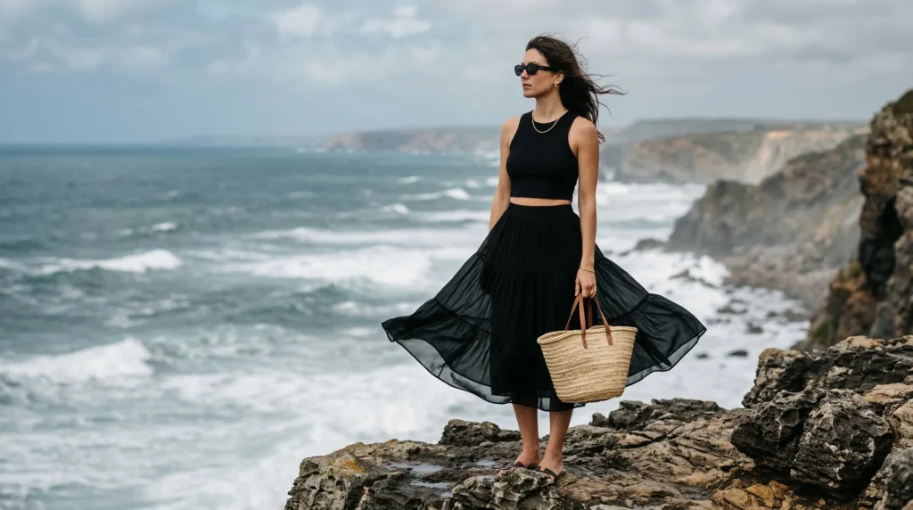 What keeps this look from feeling heavy is the balance and the movement. The cropped top shows just enough skin to keep it seasonal, while the flowing skirt moves beautifully in a sea breeze in a way that a structured skirt simply doesn’t. A straw bag softens the darkness with natural texture, and sunglasses and minimal jewelry finish the look without distraction. This is proof that black coastal style outfits can feel every bit as spring-appropriate as pastels when the silhouette is right.