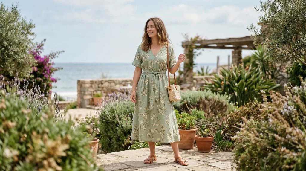 Ending on a softer note feels exactly right for a spring coastal style guide. A green printed spring beach day dress with a relaxed fit brings warmth, ease, and a sense of quiet everyday joy that sums up what spring at the beach is really about. It’s casual enough for daytime exploration but polished enough to feel genuinely intentional.