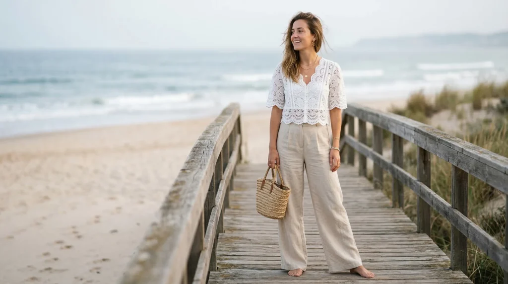 There’s something undeniably romantic about pairing a delicate lace beach top with relaxed, flowing trousers, and this look captures that mood perfectly. A cropped lace blouse with a soft neckline balanced by airy wide-leg trousers in a warm neutral tone creates a silhouette that feels light, breathable, and ideal for early spring beach days. It’s feminine without being precious — which is exactly where coastal style 2026 seems to be landing.
