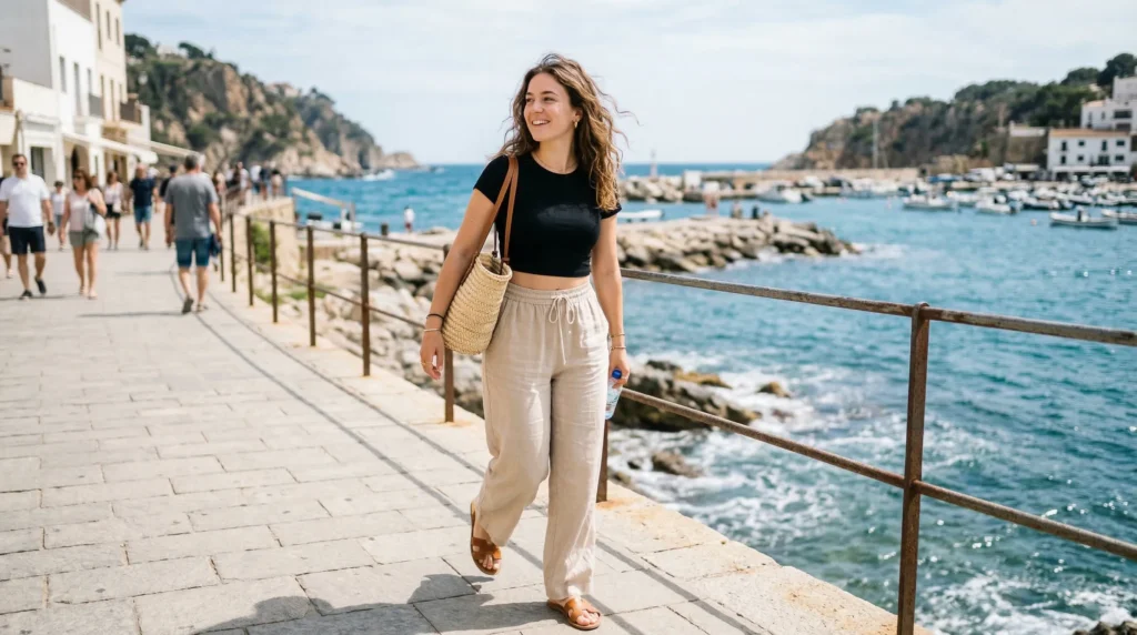 This look feels more urban, but that’s exactly why it works for spring beach styling 2026. A fitted black cropped top paired with soft neutral drawstring pants creates a clean, confident silhouette. It’s simple, but not boring. The balance between structure on top and ease on the bottom makes it incredibly wearable — and incredibly easy to pack.