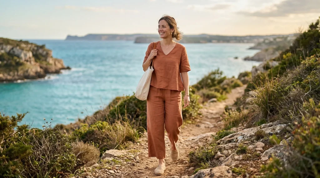 Earthy tones like terracotta photograph beautifully near water and stone, which is an underrated bonus for a spring beach outfit. If I were adding anything, it would be flat espadrilles to keep the look perfectly grounded. Comfort here isn’t optional — it’s part of the charm.