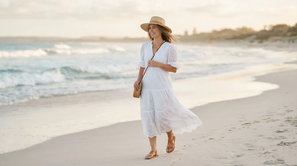 White beach dresses work best when the fabric has texture — embroidery, broderie anglaise, subtle weave — because it prevents the look from falling flat in bright outdoor light. If I were styling this for an evening by the water, I’d add a light knit draped over the shoulders. Spring evenings at the coast always cool faster than you expect.