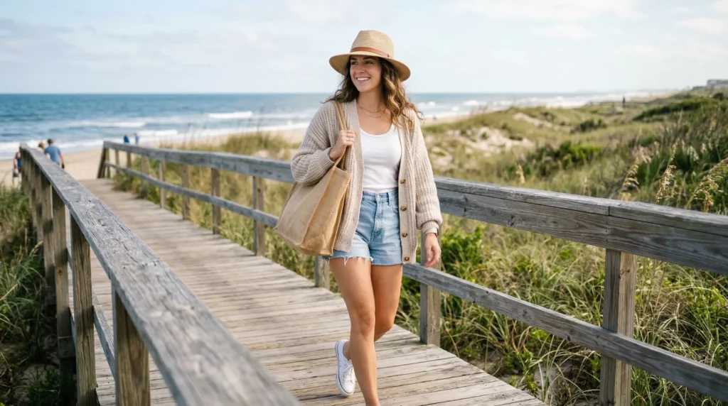 The pieces here are genuine wardrobe workhorses. A ribbed tank hugs just enough without feeling tight. Denim shorts keep things grounded and practical. The lightweight cardigan adds flexibility for those shifting spring temperatures that make beach dressing complicated. Accessories like a straw hat, a simple chain necklace, and a structured woven bag give the outfit personality without overcomplicating it.
