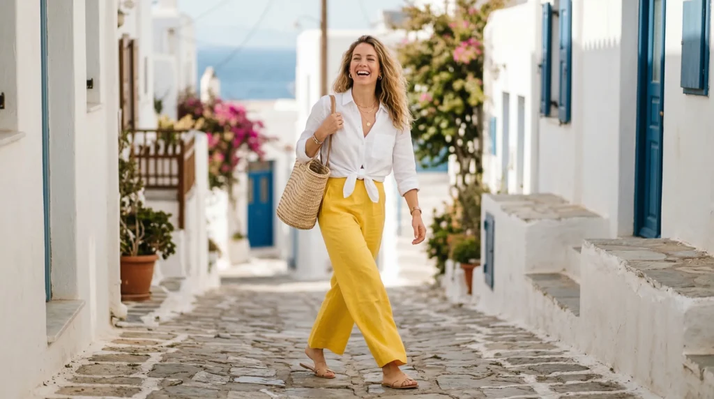 This look instantly lifts the mood, and that’s not an accident. A crisp white beach shirt paired with sunny yellow wide-leg trousers feels fresh, optimistic, and perfectly aligned with spring coastal energy. It’s classic at its core but the color choice makes it feel current and genuinely joyful — the kind of outfit that makes other people smile when they see you in it.