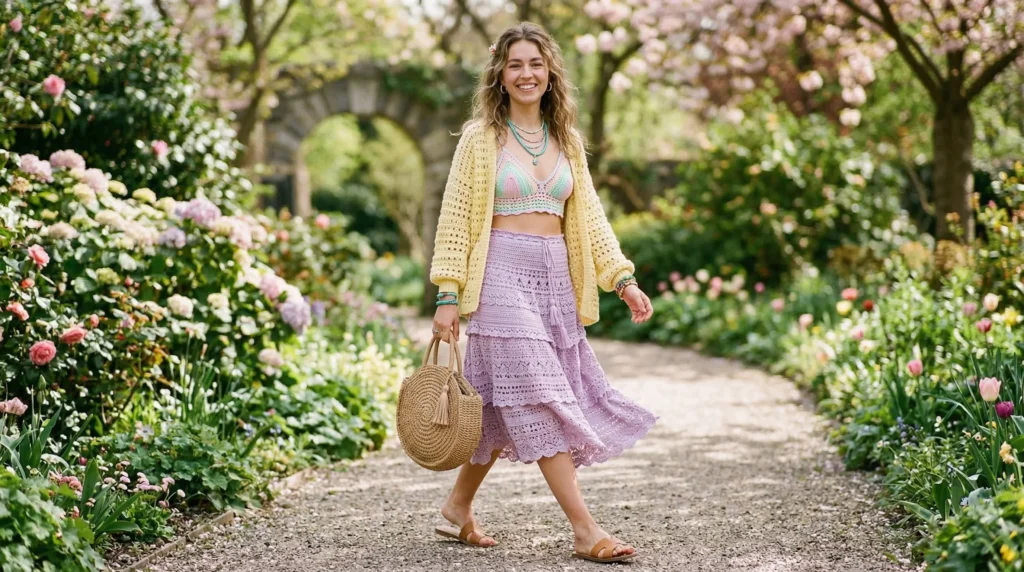 Pastels, crochet textures, and layered accessories come together effortlessly here. A delicate bralette paired with a lilac lace skirt feels light and youthful, while an open-knit cardigan adds movement and softness. A straw bag and layered turquoise jewelry give the look that unmistakable boho identity, grounded by comfortable flat sandals.