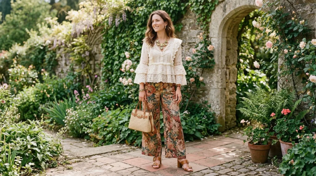 A layered blouse with lace detailing brings drama without heaviness, while wide-leg floral trousers add flow and subtle pattern. Accessories are thoughtful — a sculptural necklace, structured woven bag, and sleek heels bring polish without stripping away the boho spirit entirely.