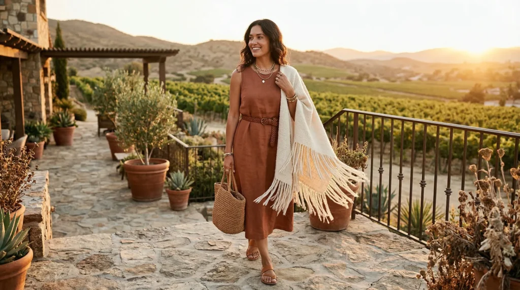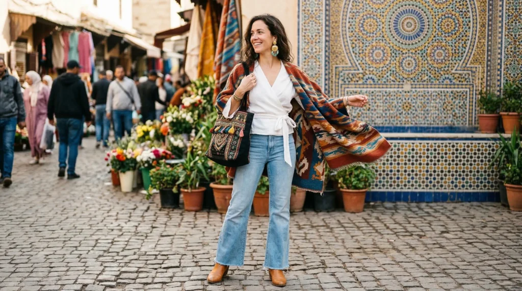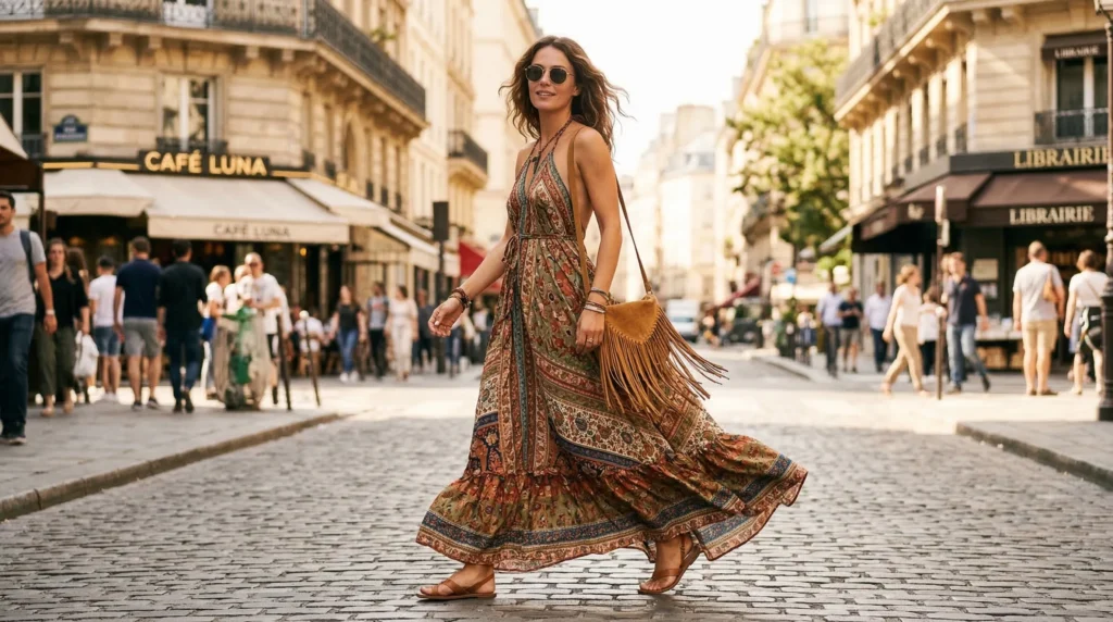 Now here’s where it gets interesting: this is the kind of outfit that works across seasons because the shawl does double duty. On cooler mornings it’s a layer; on warm afternoons it becomes a bag accessory or a waist wrap. That adaptability is exactly what spring 2026 boho style is moving toward.