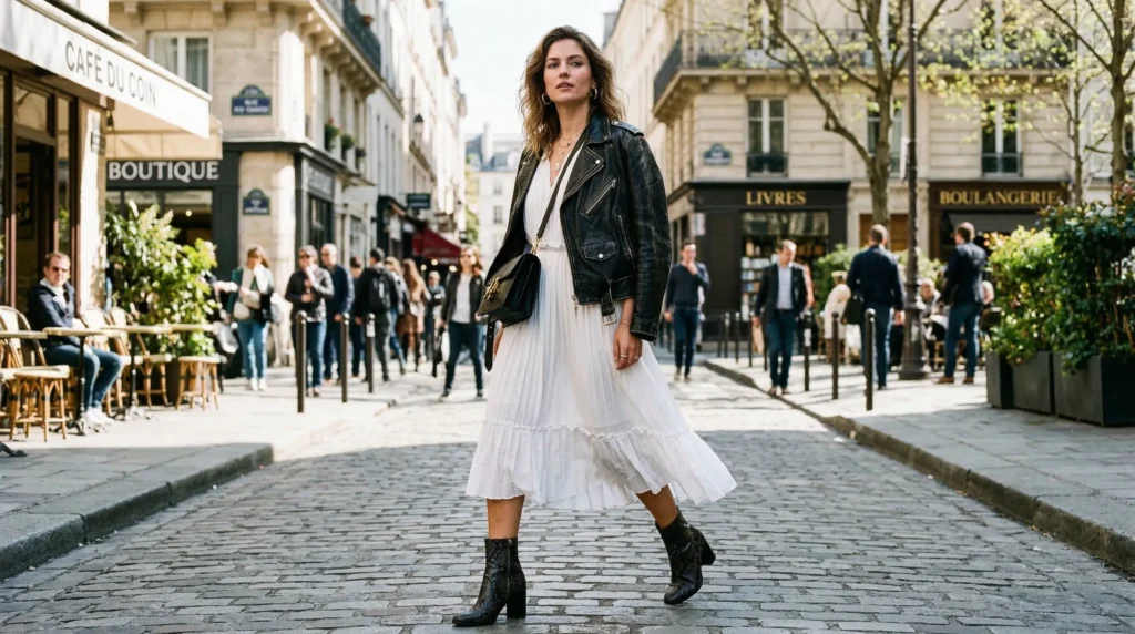 A pleated white midi dress brings movement and femininity. The leather jacket layered over it adds structure and real edge. Snake-print boots and a clean structured bag push the look into confident, almost editorial territory without overpowering the softness underneath.