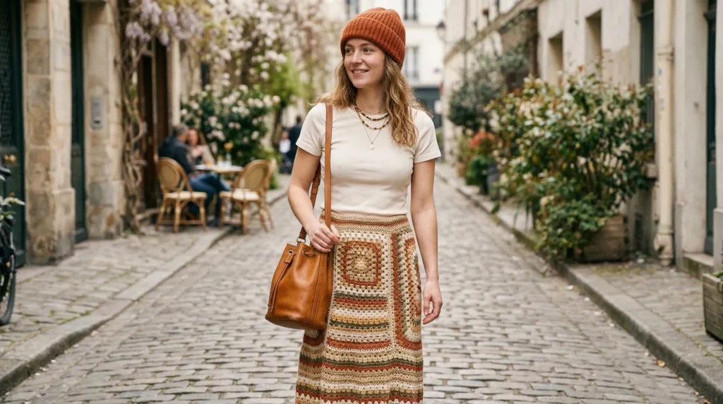 A simple fitted tee balances the intricacy of a crocheted midi skirt, creating contrast without tension. The crochet is doing all the visual work; the tee just supports it. A warm leather bucket bag adds practicality, while a knit beanie introduces a casual, lived-in touch that keeps the look from feeling too precious.
