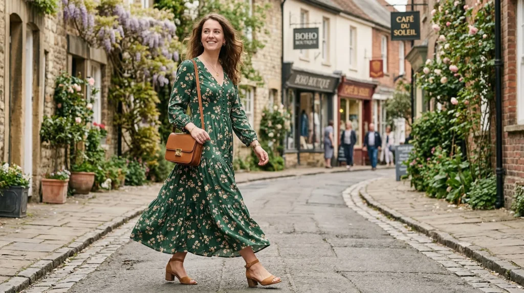 A flowing green maxi dress with a soft floral pattern feels organic rather than decorative. Long sleeves add balance and make it practical for cooler spring mornings. A structured crossbody bag and block-heel sandals give the look stability and a quiet polish that keeps it from feeling too casual.