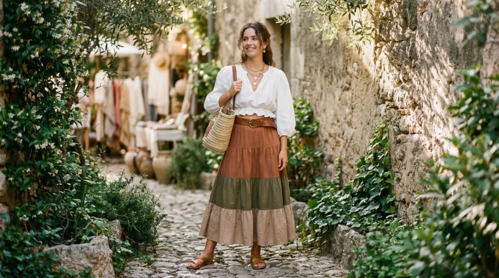 The blouse brings lightness and a touch of skin without being revealing. The skirt’s layered panels and subtle print add depth and movement. A leather belt grounds everything, and natural accessories — a straw bag, layered necklaces, flat sandals — keep the look practical rather than precious.