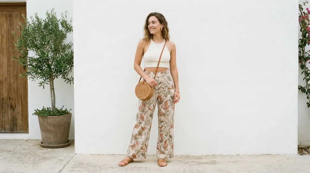 A simple halter-style top paired with wide printed trousers creates an easy vertical line that feels clean and modern while still holding onto that free-spirited boho core. The color palette stays soft and natural, letting the silhouette do the talking. Accessories are minimal but thoughtful — a woven bag, flat sandals, nothing loud.