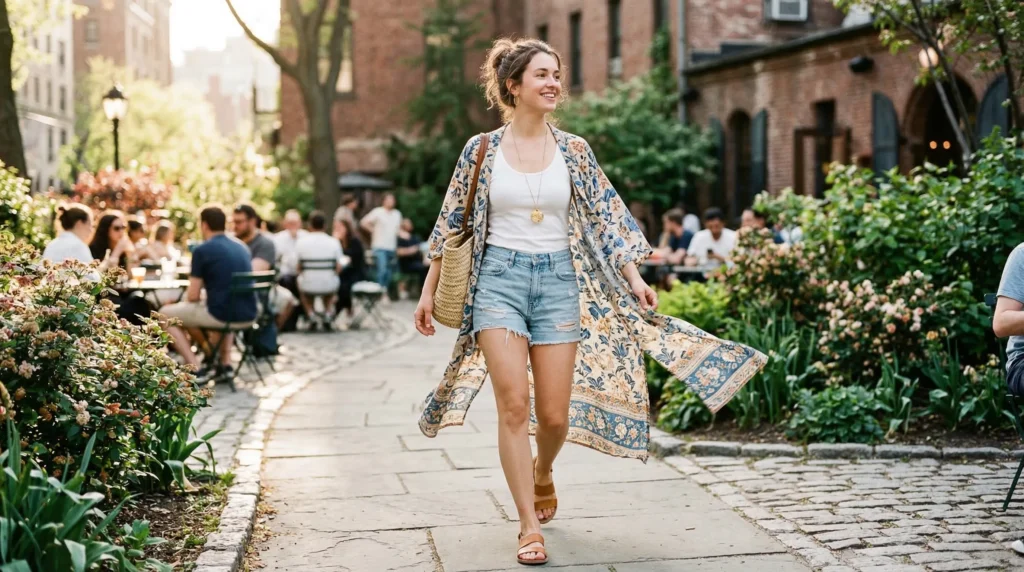 Layering in spring is genuinely an art — and this look gets it right. A lightweight kimono worn over a simple tank and denim shorts feels effortless and intentional at the same time. It’s casual, but it still reads as styled, which is a harder balance to strike than it looks.
