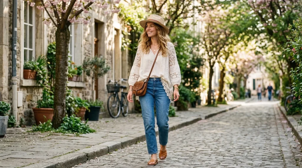 An airy white tunic with delicate lace sleeve details softens the structure of classic straight-leg denim beautifully. The blouse is the hero here — loose, breathable, romantic without being fussy. The jeans ground the look and make it genuinely wearable for everyday spring moments. A straw hat, flat sandals, and a small leather crossbody keep everything practical and sun-ready.