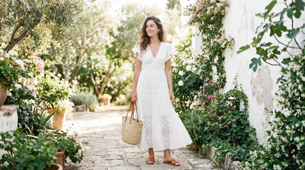 An eyelet maxi dress in all white is light, breathable, and textured in the most understated way. It doesn’t rely on bold accessories — just a woven tote and natural materials to keep the look organic. This is boho that proves restraint can be just as expressive as layering.