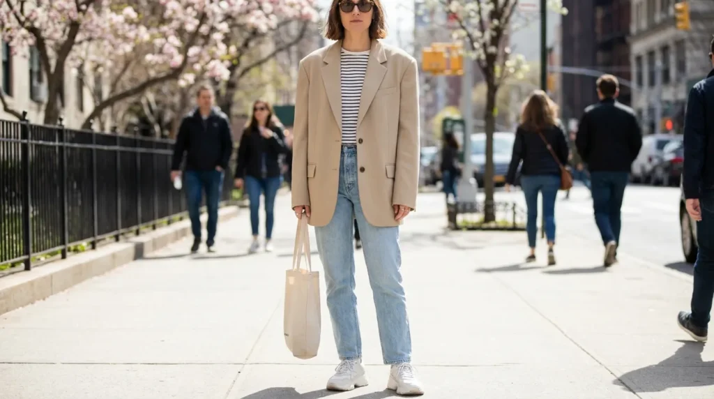 A soft pink or camel blazer over a simple white or graphic tee. Straight-leg or wide-leg denim. A baseball cap for Saturday energy or a pointed-toe loafer for something more polished. This is possibly the most wearable everyday spring outfit in existence — it transitions from coffee to errands to casual lunch without a single wardrobe change.