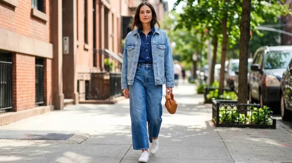 Denim remains essential, but the 2026 update is about fit and wash. Wide-leg and straight-leg silhouettes are still reigning, and lighter washes — cream denim, pale blue, and white — feel especially fresh for spring fashion outfits.