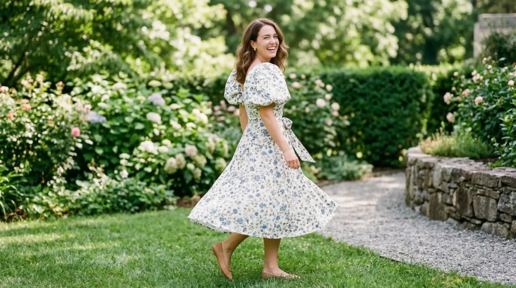 A midi dress with puff sleeves, a fitted waist, and a soft print — florals or delicate patterns in spring colors. Simple accessories and ankle boots or ballet flats. This look works for garden parties, celebrations, or any occasion where you want to feel feminine and confident.