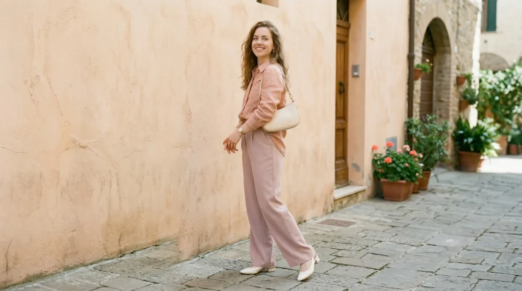 A blush pink button-down shirt worn slightly open and tucked into high-waisted fluid blush trousers. Clean white sneakers or pointed-toe flats. A small shoulder bag. Minimal jewelry. This tonal approach instantly looks styled because the color does all the work. Editors at Vogue have noted for years that monochrome creates instant elegance — and this is the casual version of that principle.