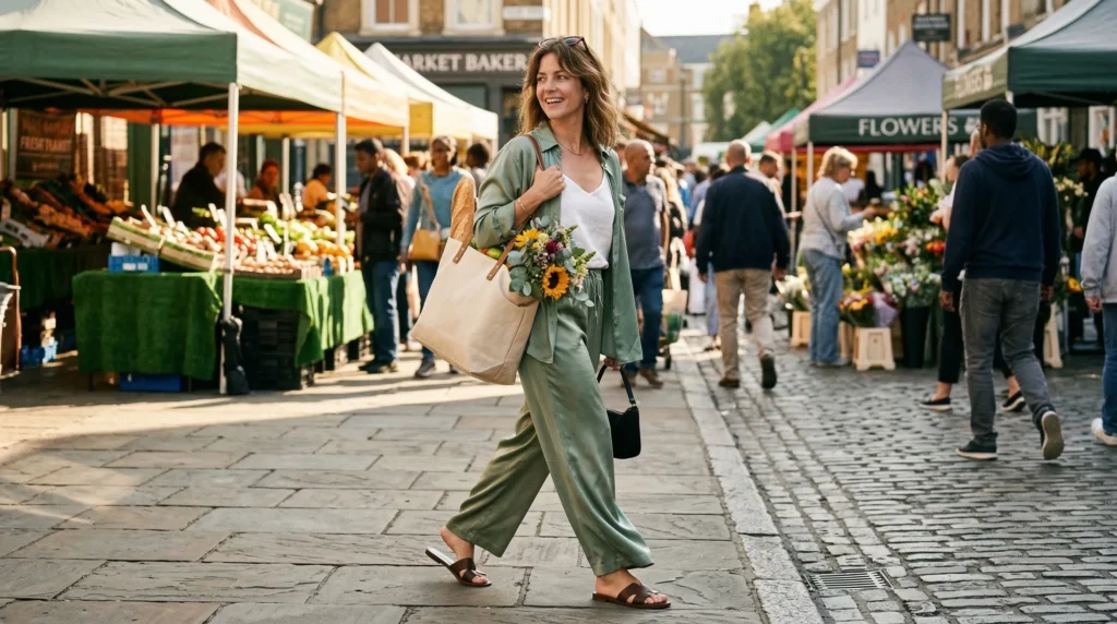 A silky, loose-fitting matching set in a soft spring tone — sage green, dusty rose, or warm ivory. Wide-leg silk trousers and a relaxed shirt in the same fabric. Flat sandals or sneakers. A roomy tote bag. This look reads as effortless but is actually extremely intentional. According to Harper’s Bazaar’s coverage of quiet luxury trends, silk and satin coordinate sets have become one of the defining aesthetics of 2026 casual dressing.