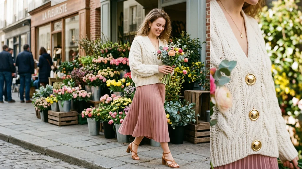 A cozy cardigan with playful detail — bold buttons, a fun motif, or an unexpected color — over a pleated or full midi skirt in a complementary neutral. Heeled sandals to keep the proportions long. This look is soft, feminine, and quietly stylish. It’s the kind of outfit that makes people stop and ask ‘where did you get that cardigan?’