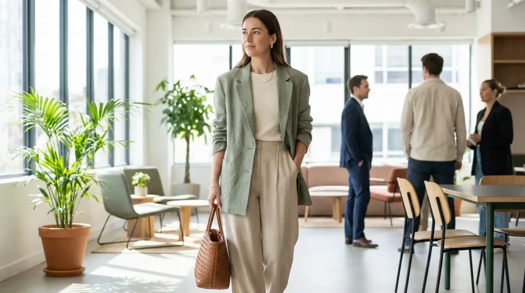 A tailored blazer in dusty blue or sage green over a simple fitted top, worn with wide-leg trousers in a complementary neutral. Kitten heels or clean loafers finish the look. This outfit communicates competence and style at once.