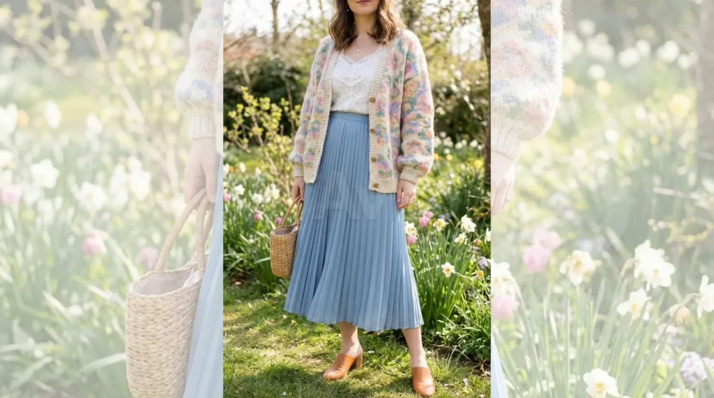 Soft knits — think ribbed modal, pointelle, or lightweight cotton knit — work as the layering anchor for the season. A cardigan in a spring color over a simple outfit is one of the easiest styling moves you can make.