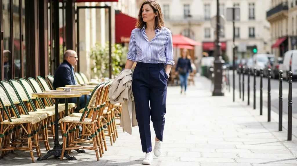 An oversized striped cotton shirt layered over a white or neutral cropped top, worn with tailored trousers in beige or soft olive. This Parisian-mood look is the definition of effortless. Swap sneakers for loafers depending on the day. It doesn’t try too hard, which is exactly the point.