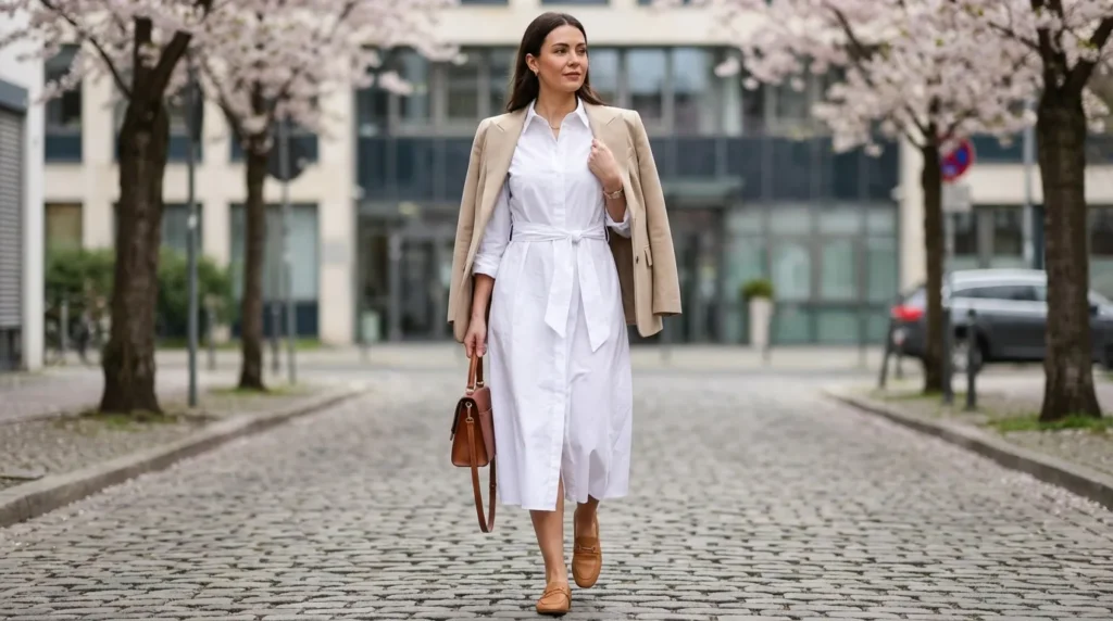 Step 1 — Start with a classic base. White shirt dress, tailored trousers, or a blazer-skirt combo in a neutral. Step 2 — Introduce spring color in one place only. A bold top, a statement belt, or colorful shoes — pick one. Step 3 — Keep everything else clean. Neutral shoes, minimal jewelry, a structured bag. Step 4 — The final test: stand back and remove one thing. If the outfit still looks great, it’s done. Less is almost always more in a work context.