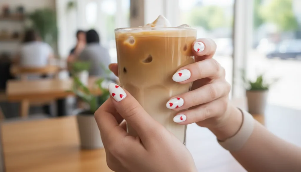 3. White Nails with Tiny Heart Accents