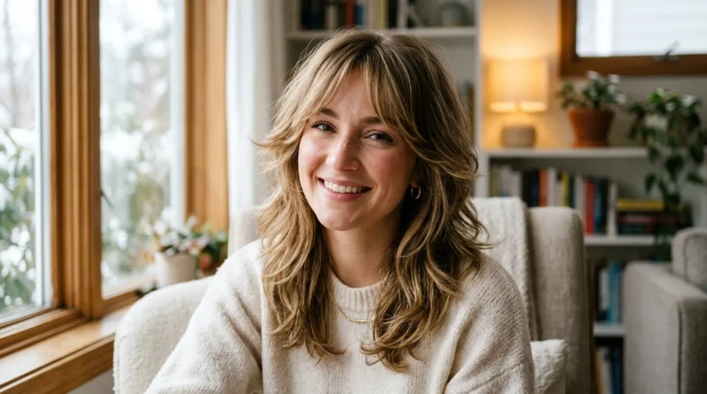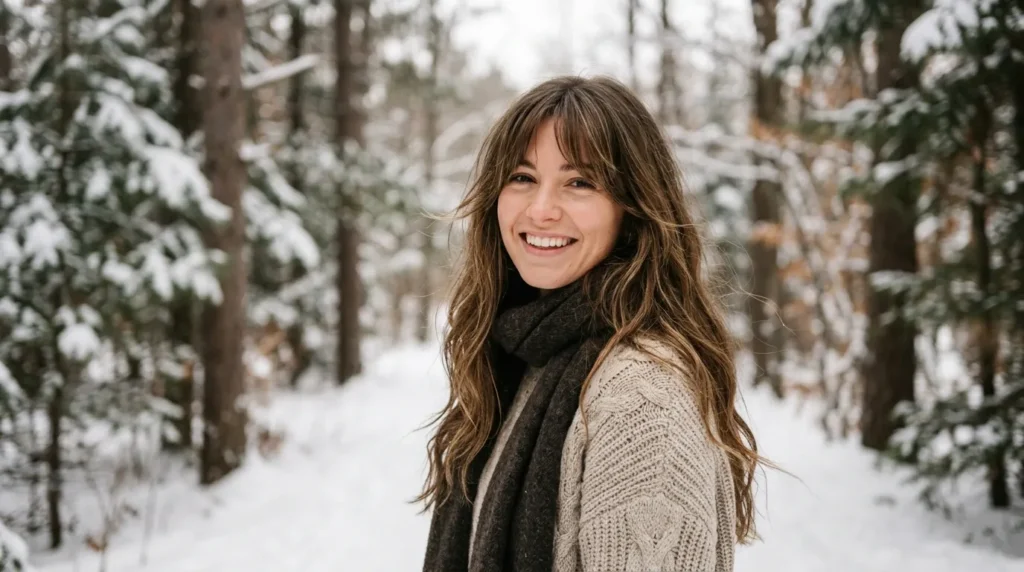Pair curtain bangs with long layers and you’ve got one of the most popular cute winter haircuts 2025-2026 trendy hairstyles this season. The layers add movement and keep the look from feeling flat in dry winter air. This works on almost every face shape, but it’s especially flattering for heart-shaped and longer faces.