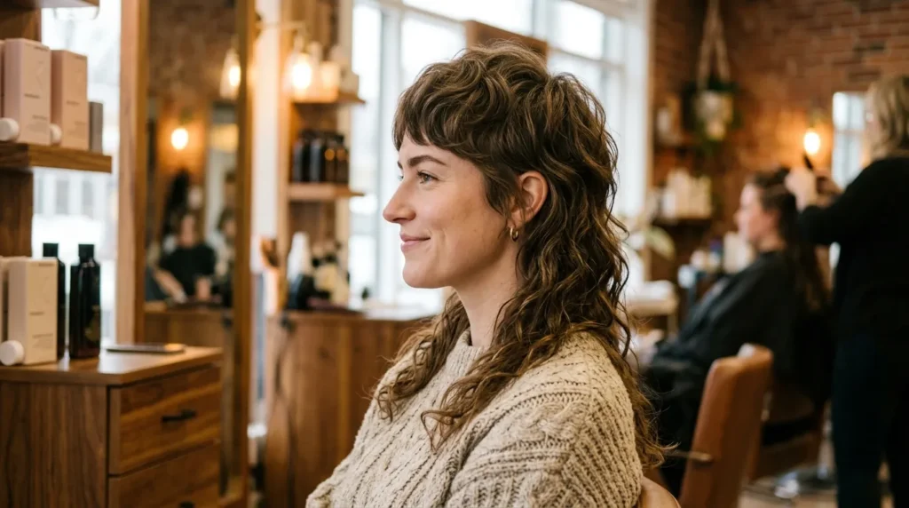 This is where the textured shag, feathered shag, and modern mullet really shine. You want a cut that embraces your natural pattern, not one that fights it. Look for a stylist who cuts curly hair dry — this way they can see exactly how each curl falls and layer accordingly. Curtain bangs work on curly hair too, though they’ll need a little more styling attention in the morning.