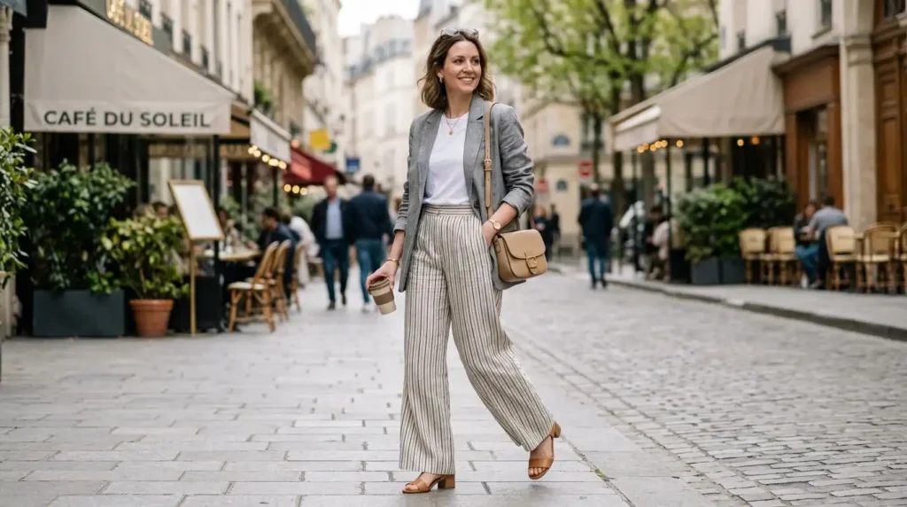 A soft grey blazer layered over a simple T-shirt with wide-leg striped trousers is the modern answer to “I need to look put-together but I also need to be comfortable for six hours.” The trousers do the heavy lifting aesthetically. The blazer signals polish. The tee keeps everything breathable.