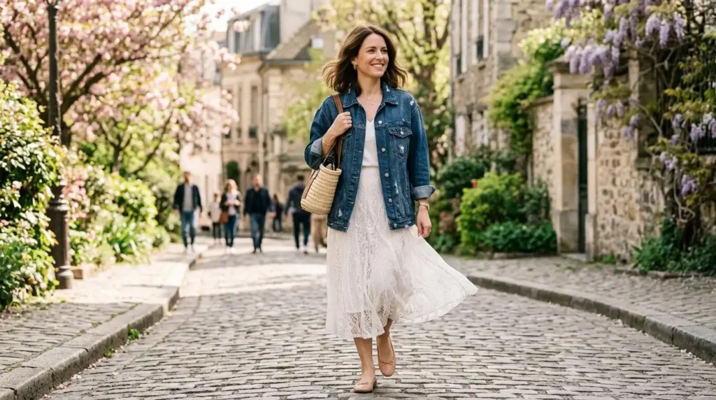 A roomy denim jacket layered over a flowing lace skirt or a white chiffon midi is one of the best solutions here. For daytime, tempering a delicate or feminine look with spring staples like a relaxed blazer or lightweight trench and ballet flats creates the right balance of practical and polished. The jacket comes off when it warms up. The skirt underneath already stands alone.