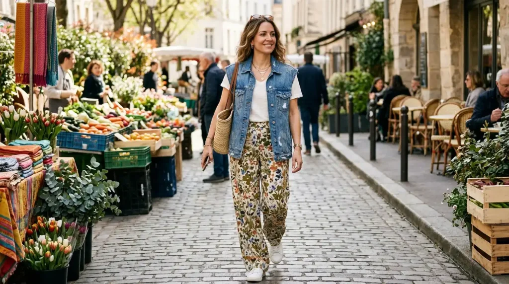 A sleeveless denim vest paired with wide-leg leopard-print or floral trousers sounds unlikely, but it works beautifully as a warm-day formula. The denim provides structure and frames the look. The fluid trousers add movement and ease. Treat the print as a neutral — keep everything else clean and simple.