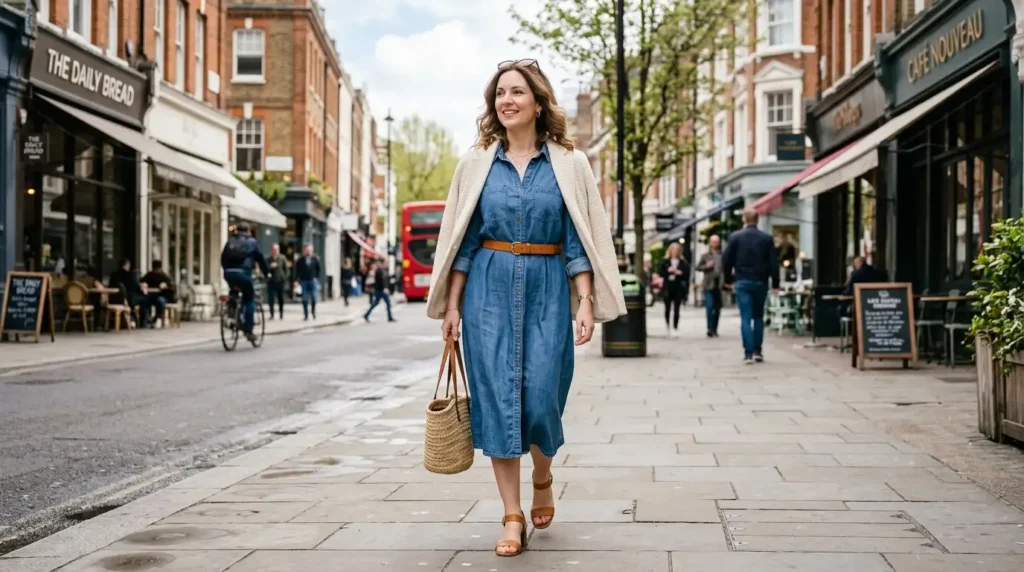 Don’t underestimate the denim shirt dress. It’s one of those pieces that solves outfit decisions entirely. Wear it loose with flat sandals for casual mornings. Belt it at the waist with block heels for lunch. Throw a blazer over it for an afternoon meeting. It transitions without you having to think about it, which is the actual definition of a wardrobe staple.