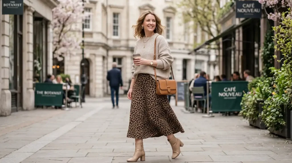 An oversized cream or oatmeal knit with a printed or textured skirt — leopard, stripe, or jacquard — is the contrast formula your spring wardrobe needs. Keep the bag and shoes in neutrals. Let the one print or texture do the work.