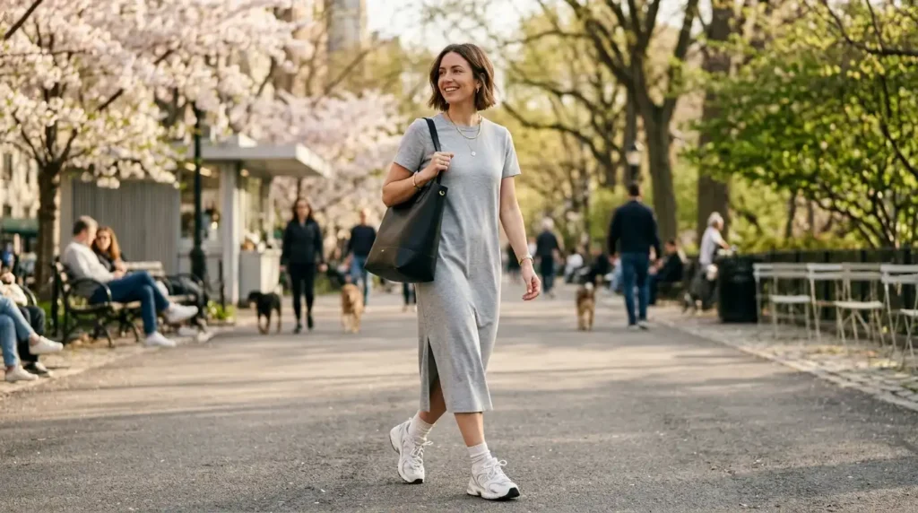 A clean, well-cut midi T-shirt dress in white, cream, or soft grey is the ultimate busy-day outfit. It’s one piece. It moves. It photographs well. Add chunky sneakers and a structured black tote, and you have something that looks intentional without requiring any actual decision-making in the morning.