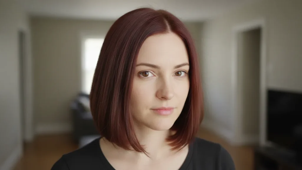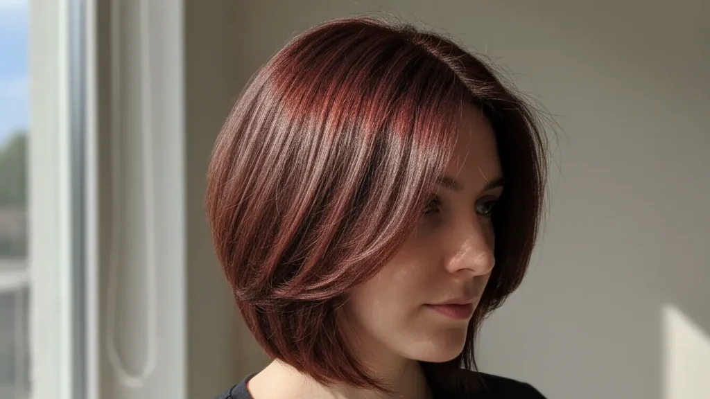 The layers prevent the bob from looking too blunt or severe, creating movement and softness that complements the warmth of the auburn beautifully. It’s sophisticated enough for professional settings but fun enough for weekends.