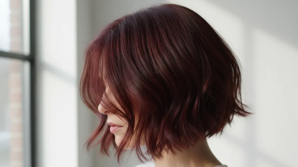 Short hair and deep auburn hair are a match made in heaven. A textured bob showcases the color beautifully while creating a modern, edgy vibe that’s absolutely chic and current for 2026.