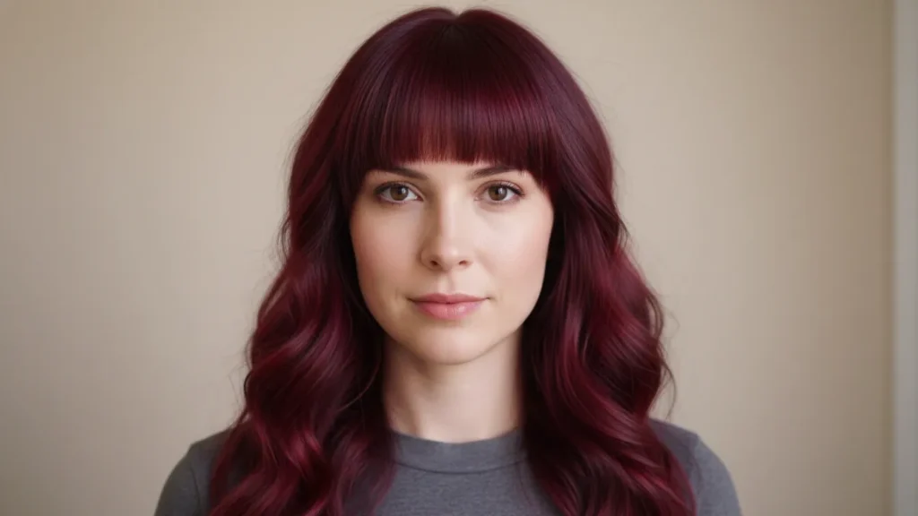 This combination creates bold, sultry appeal among deep cherry red hair color ideas. The structured fringe adds definition and edge while soft waves bring movement and flow for perfect balance.