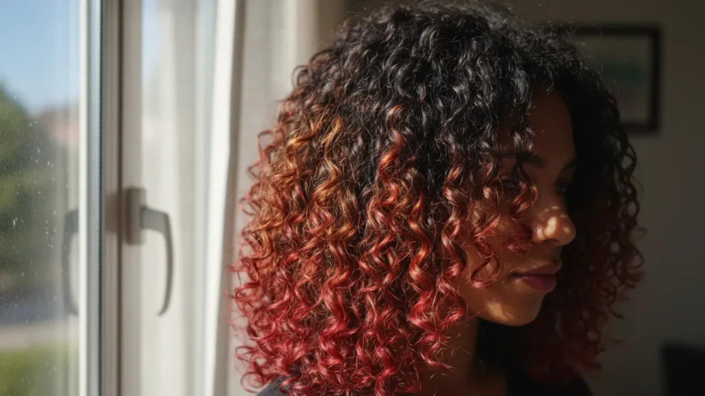 In my experience, curly hair holds vibrant color really well because the texture creates natural dimension that makes the deep cherry red look multifaceted.